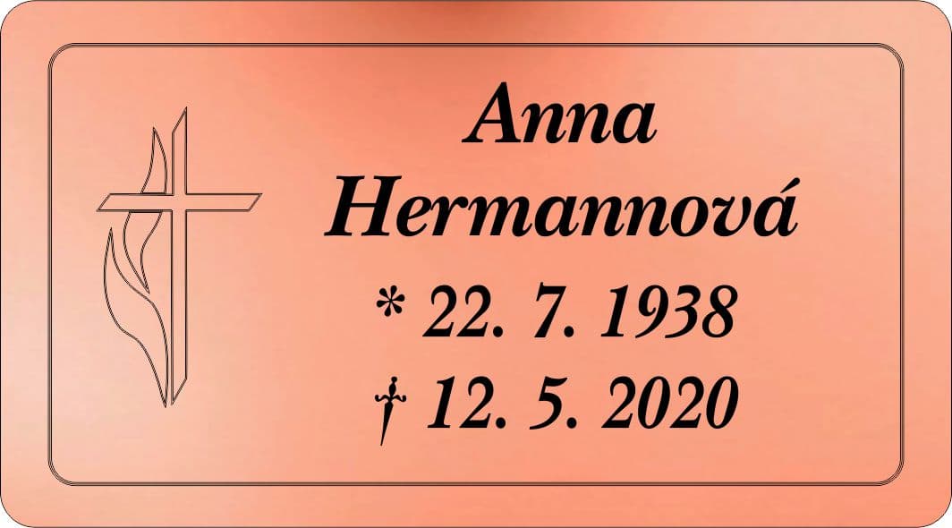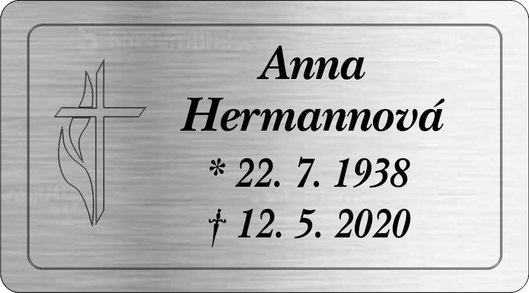 Smuteční cedulka gravírovaná  na pomník, urnu. Zcela odolná počasí a věku. Gravírované cedulky neblednou, jsou stálé i na přímém slunci.  Podrobnosti a odpovědi na časté dotazy zde