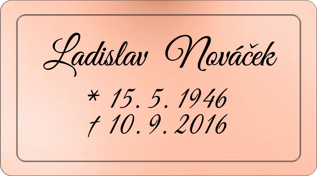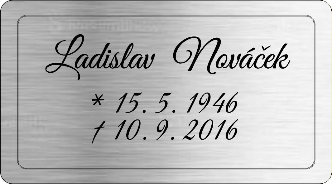 Smuteční cedulka gravírovaná  na pomník, urnu. Zcela odolná počasí a věku. Gravírované cedulky neblednou, jsou stálé i na přímém slunci.  Podrobnosti a odpovědi na časté dotazy zde