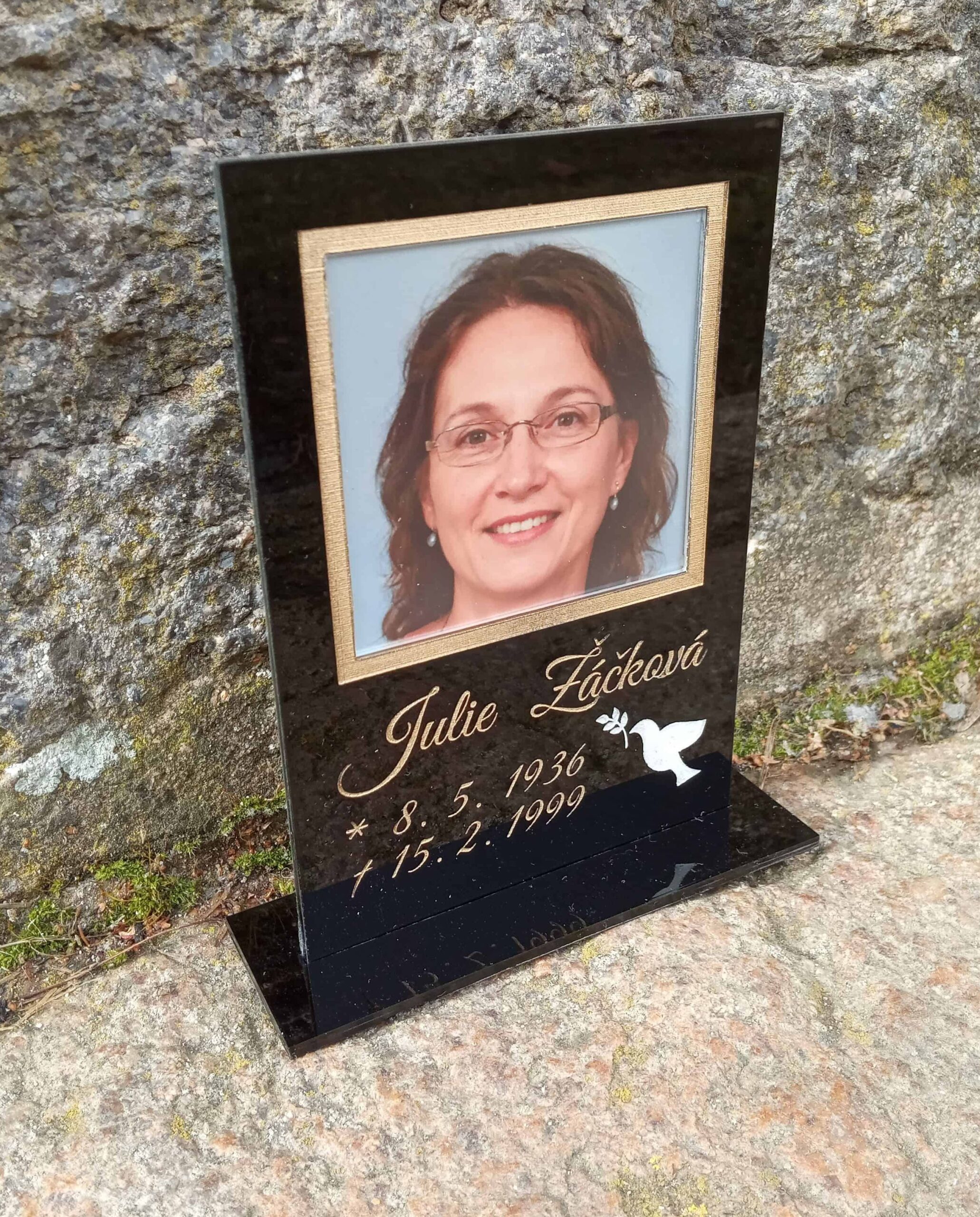 Můžete si také objednat přizpůsobenou cedulku se změnami ve velikosti písma, tvaru, obrázku, rozložení a rámečku, abyste vytvořili dokonalý náhrobní stojánek přesně podle svých představ. Barevné foto je potištěno na hliníkový plech pomocí vysoké teploty a tlaku a poté překryto sklíčkem s UV ochranou a antireflexní vrstvou, což mu zajišťuje dlouhodobou životnost. Foto není trvale spojeno s deskou, což umožňuje jeho snadné výměnu. Pro více informací navštivte časté otázky.